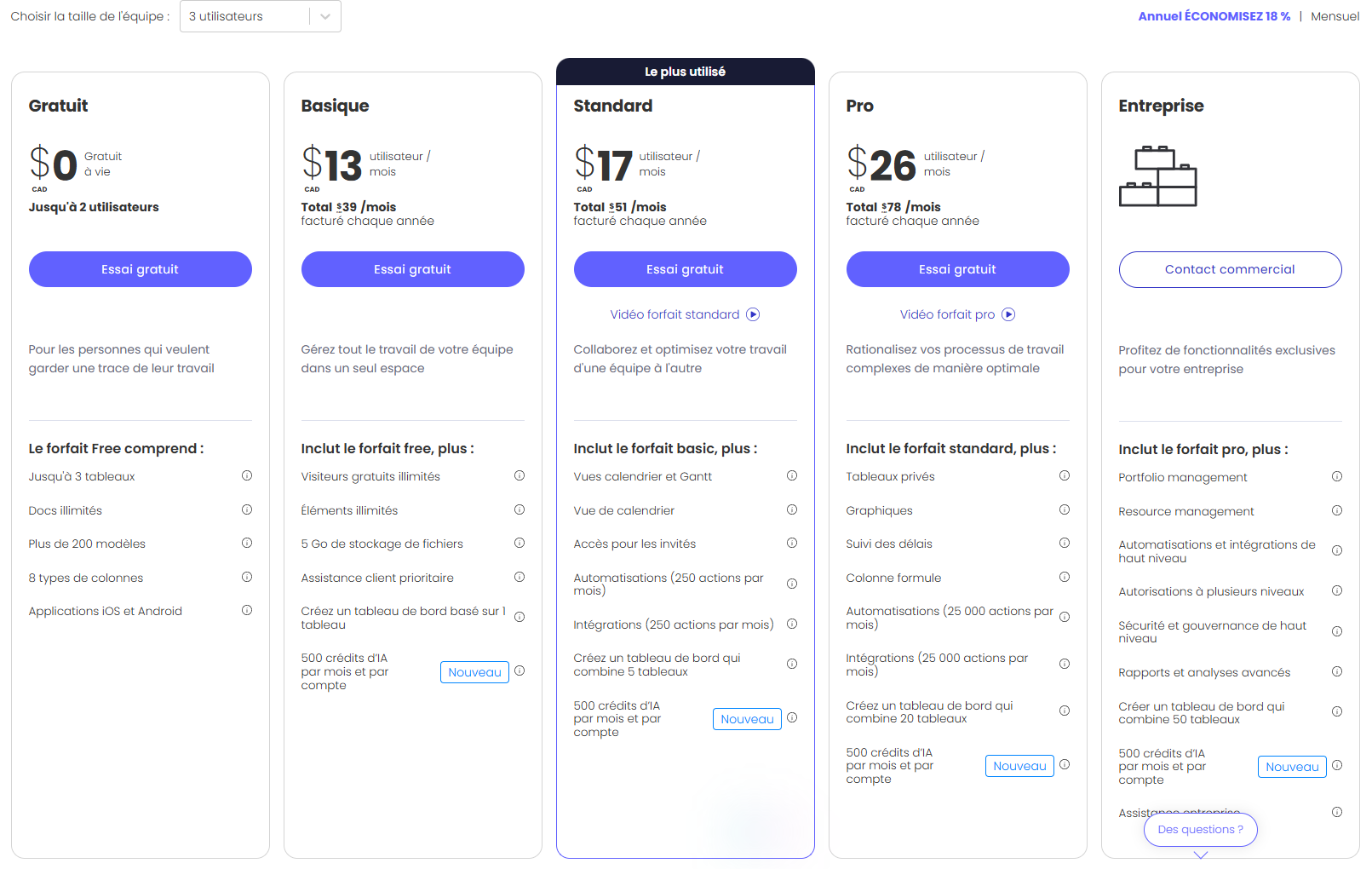 Il faut un minimum de 3 utilisateurs (soit environ 48 $ CAD/mois pour le plan Basic si payé annuellement).